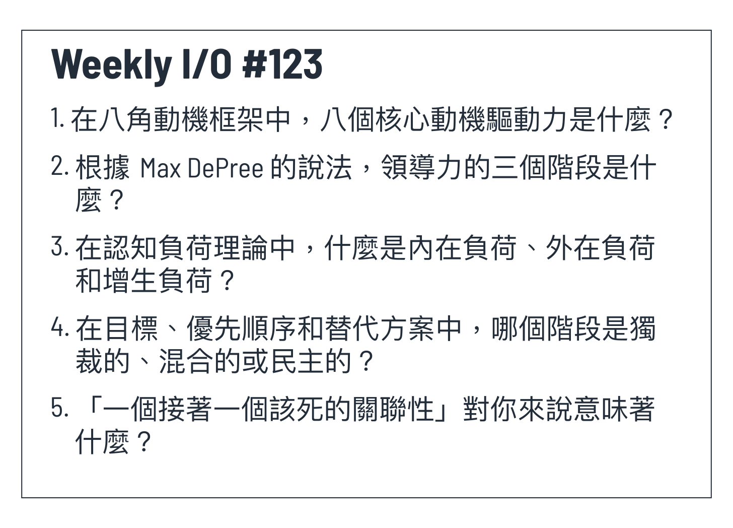 Weekly I/O #123:八角動機框架、藝術般的領導力、認知負荷理論、GPA 決策風格、一個接著一個的關聯性